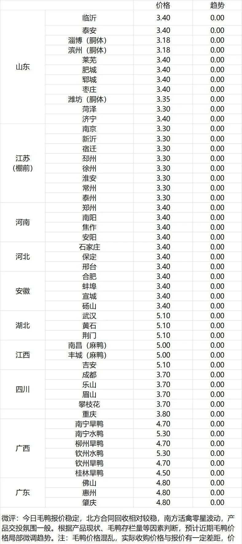微评:鸭苗报价稳定。(注:南方只报当天价格)整体交投情绪平淡。根据产品、养殖成本及鸭苗现状分析,预计近期鸭苗价格呈稳中微调趋势。种蛋报价涨5分。温馨提示:该价格为主流厂家报价,实际销售价格以成交价格为准,价格仅供参考。