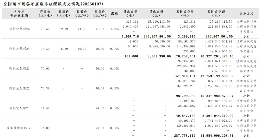2026年1月1日至1月7日,全国碳市场碳排放配额成交量3,477,032吨,成交额263,724,091.50元。