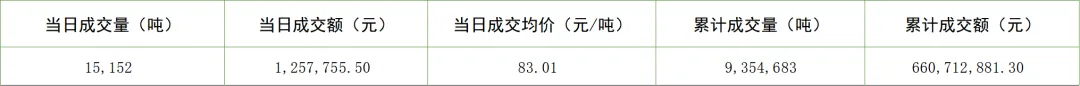 今日挂牌协议交易成交量324,311吨,成交额25,286,503.50元;大宗协议交易成交量3,046,405吨,成交额229,982,688.00元;今日无单向竞价。