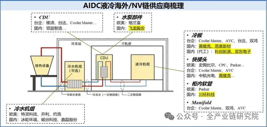 ·对冷水机行业的影响:高温水冷从一次侧解决散热问题,采用液体直接与外界环境交换的方式,无需冷水机,全球做制冷剂、水冷机的企业股价应声下跌20%,对行业形成重大利空;其核心逻辑是取消冷水机以简化系统复杂度,利用环境温差(如冬天10度、夏天30度)通过优化冷水塔实现散热效果。