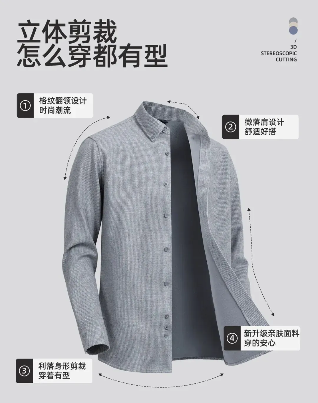 这款衬衫主打利落有型,正肩版型+3D立体剪裁,巧妙隐藏肩宽、背厚的问题,整个人瞬间挺拔精神!