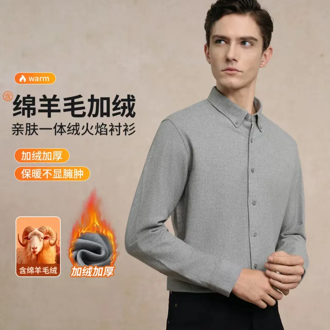 男士冬季绵羊毛加绒纯棉磨毛衬衫100%棉,加绒保暖