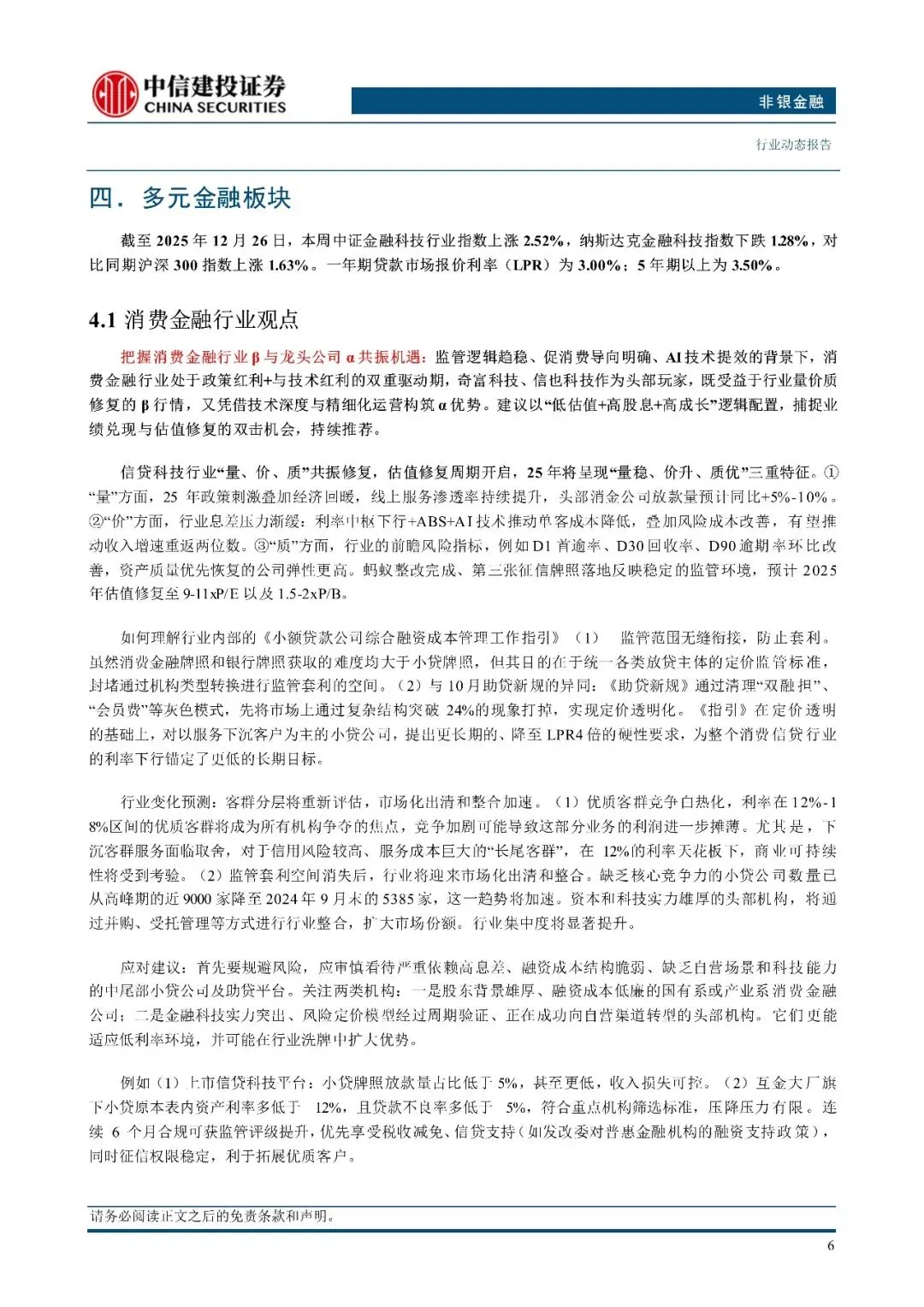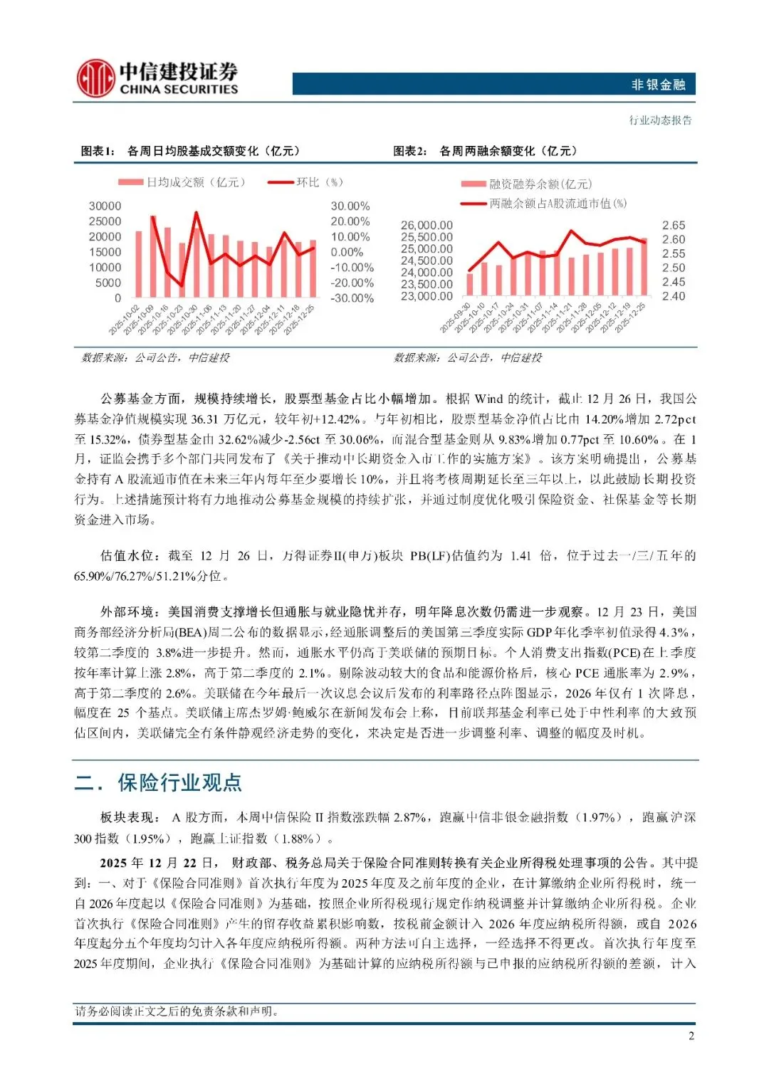 证券:本周成交量环比较节前一周小幅回升,同比保持增长,仍然维持高位。保险:利率企稳回升有望带动估值修复,寿险看好 2026 年开门红新单增速超预期,财险看好非车险“报行合一”带动承保利润较快增长。香港市场及港交所观点:美联储降息背景下,港股市场流动性宽松,关注非银板块向上弹性。多元金融观点:消费金融行业处于政策红利+技术红利的驱动期。