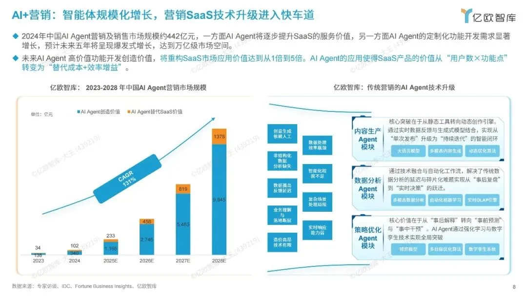 AI+消费从工具向智能伙伴演进,AI营销2025-2028年复合增长率达35%,2028年市场规模预计达到1645亿元。
