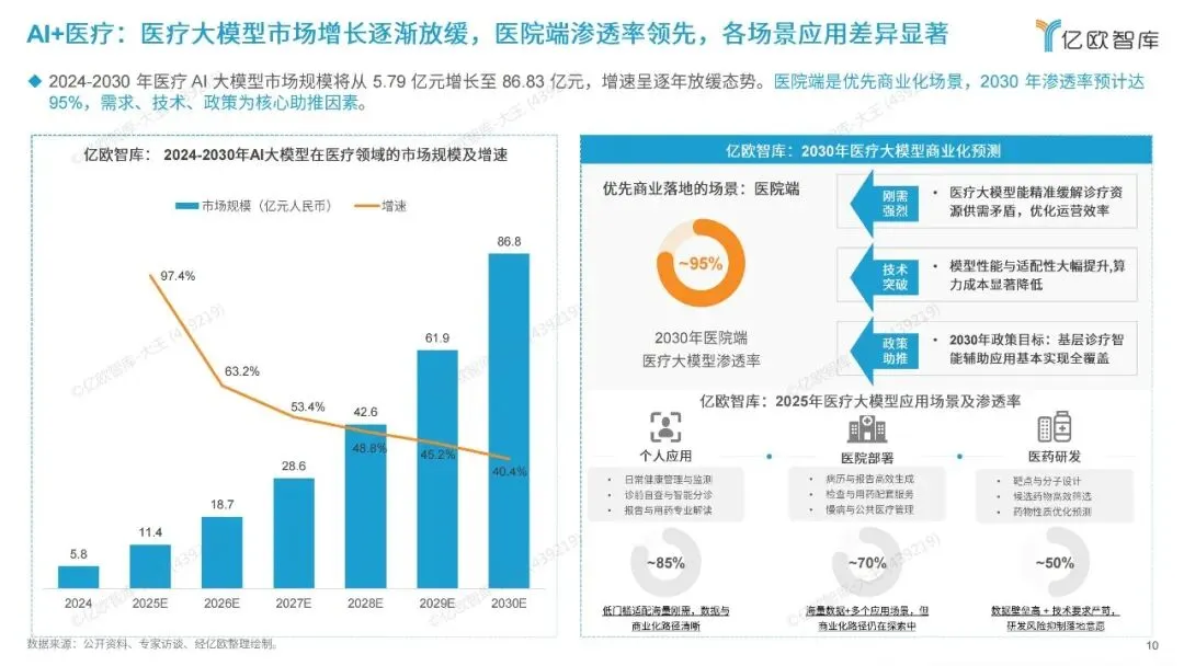 医疗大模型在医院端渗透率高达95%,2024年市场规模77.2亿元,但受技术成熟度和商业化路径探索限制,预计2030年增长至304亿元的同时增速放缓至45%左右。