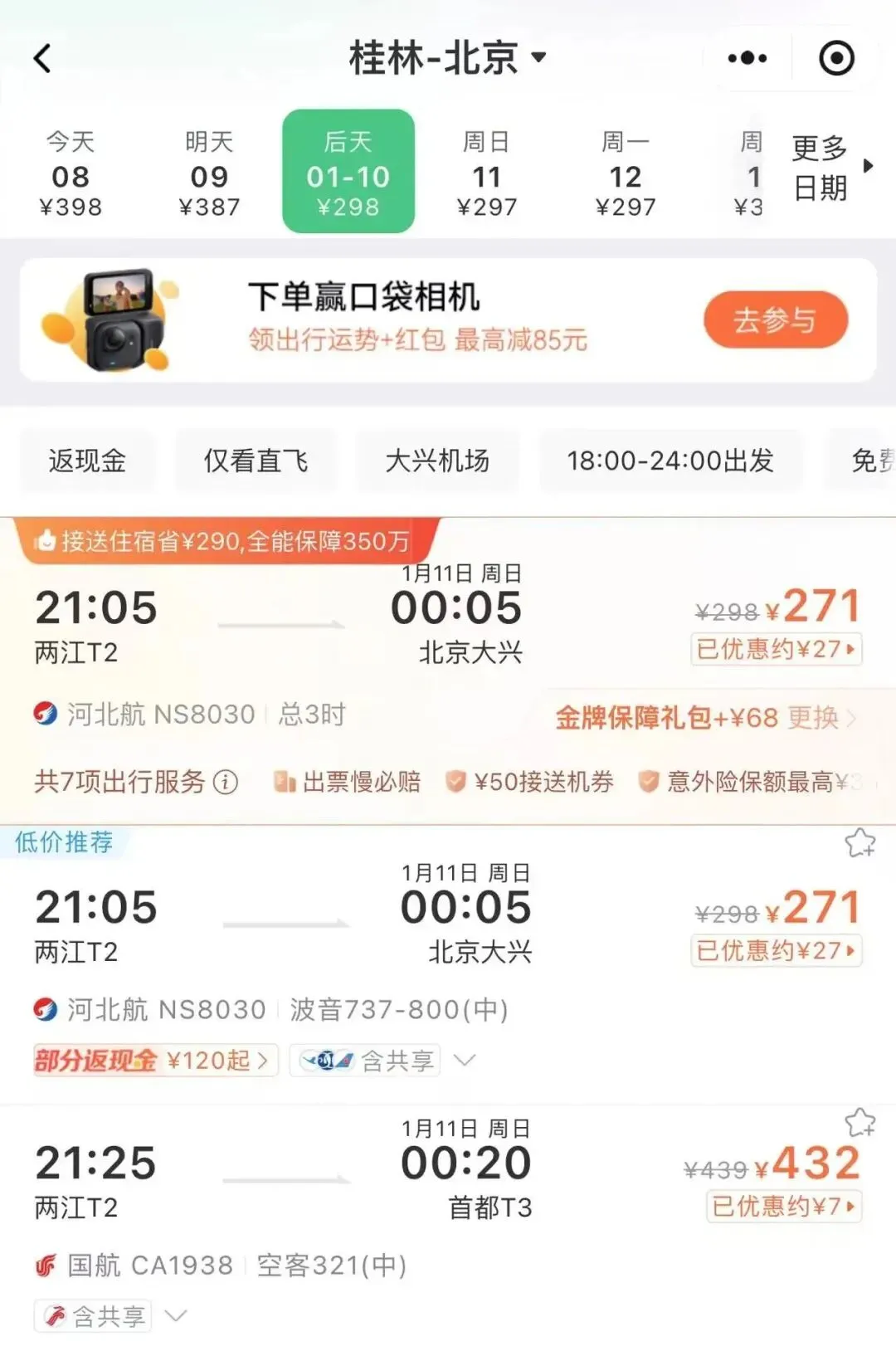 1月8日下午,记者在一家第三方售票平台查询发现,近期从桂林出发去往多个城市的机票价格低至200多元,例如1月10日,桂林到北京的最低票价为271元(不含机建燃油费)。