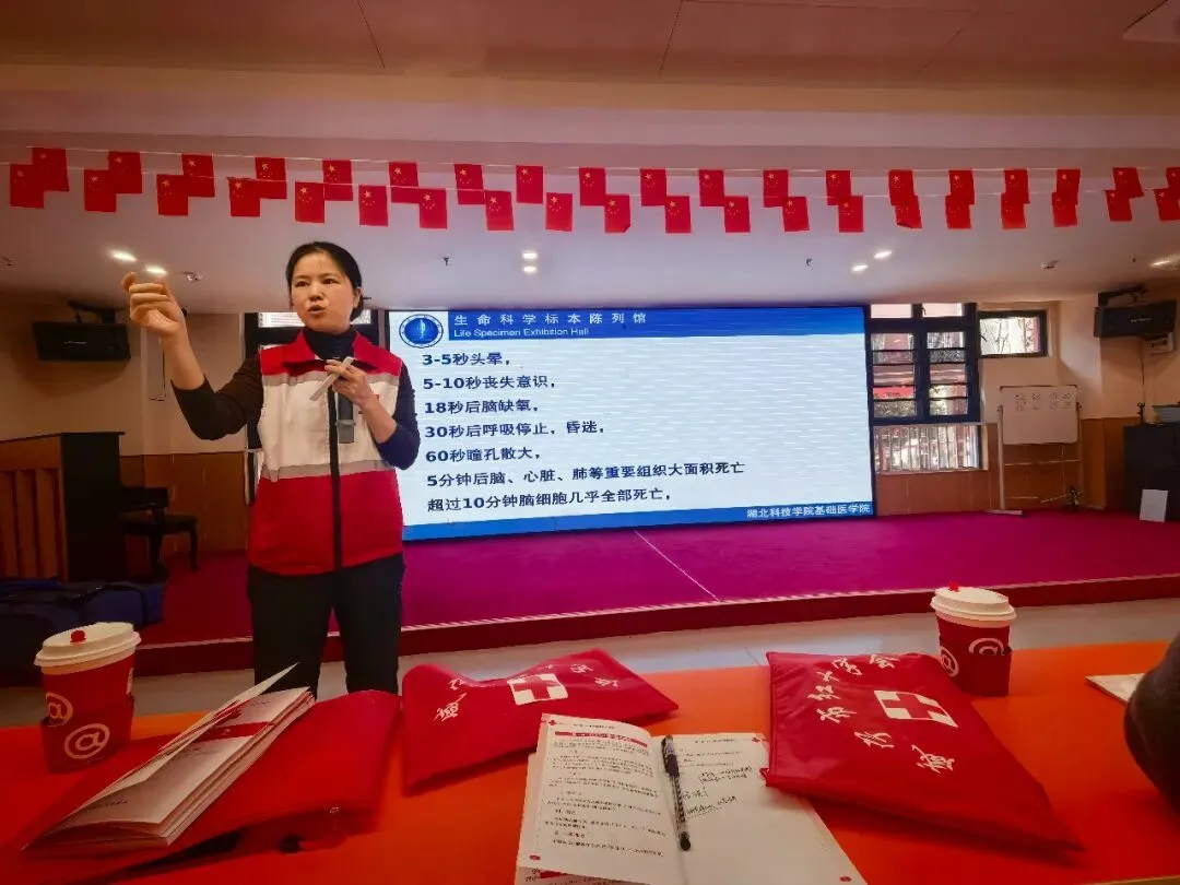 此次培训紧扣“实用、实战、实效” 原则,参照《红十字应急救护培训标准化手册》设置 8 学时课程,涵盖红十字运动与救护概论、心肺复苏(CPR)、AED 使用、创伤救护及气道异物梗阻处置等核心内容。咸宁市红十字会资深讲师团队采用“理论精讲 + 示范教学 + 分组实操 + 情景模拟” 模式,将专业知识转化为实用技能。理论授课中,讲师结合旅游场景常见的游客跌倒、创伤出血、心脏骤停等突发情况,详解应急救护核心原则与操作程序,让学员吃透实操关键要点。