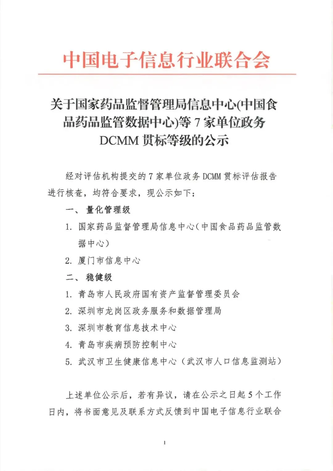【公示转发】转发中国电子信息行业联合会关于国家药品监督管理局信息中心(中国食品药品监管数据中心)等7家单位政务DCMM贯标等级的公示