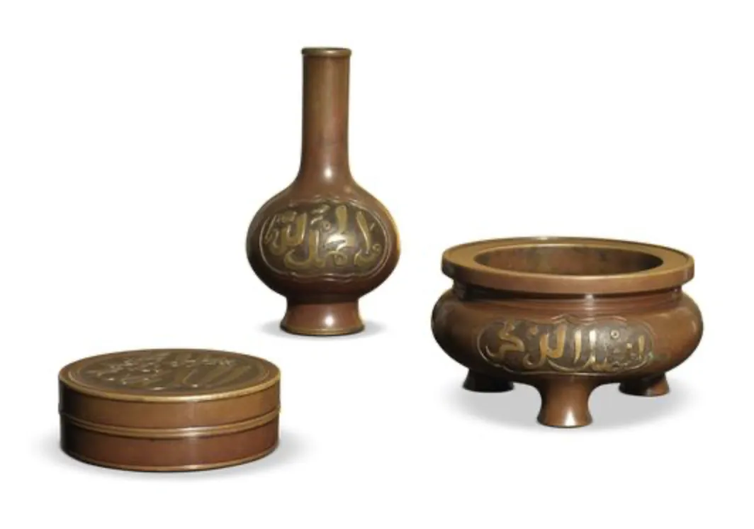 核心特征:炉底有 “正德年制” 款,炉身刻有阿拉伯文,文字优美流畅,展现出当时精湛的铸刻工艺。炉瓶盒三事成套保存完好,是明代铜炉中的精品,存世量极为稀少,拍卖时引发激烈争夺。