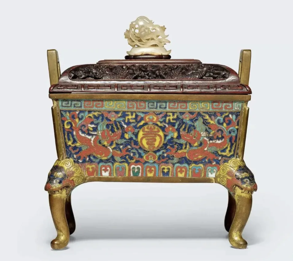 核心特征:采用掐丝珐琅工艺,炉身以双龙捧寿纹为主题,色彩鲜艳,线条流畅。方形炉体搭配精致的盖,造型独特。万历时期的掐丝珐琅铜炉存世量不多,此炉品相完好,具有极高的艺术价值。