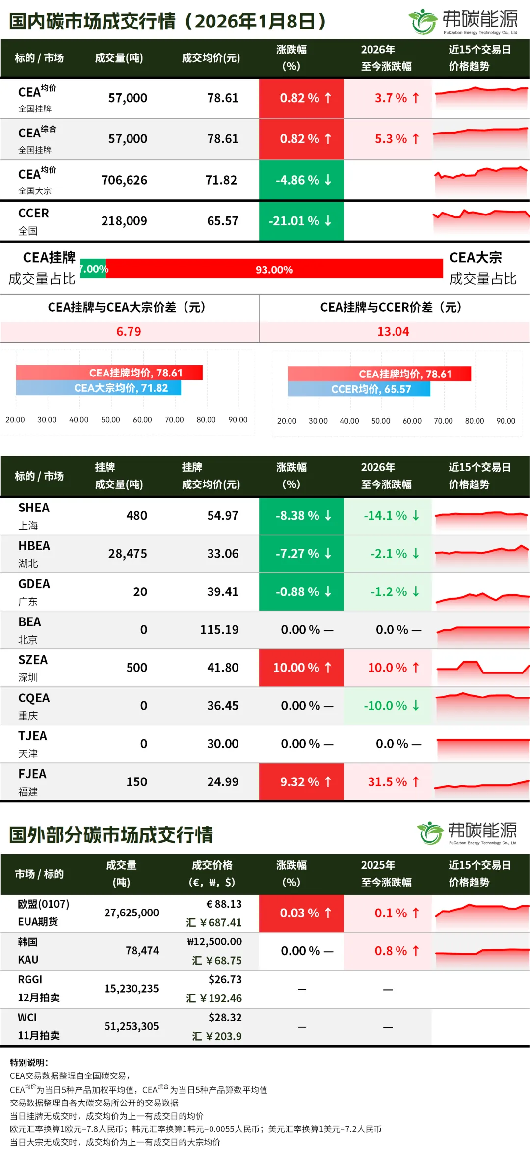 >碳市行情26.1.8 | CEA挂牌成交量5.7万吨,成交均价上涨...