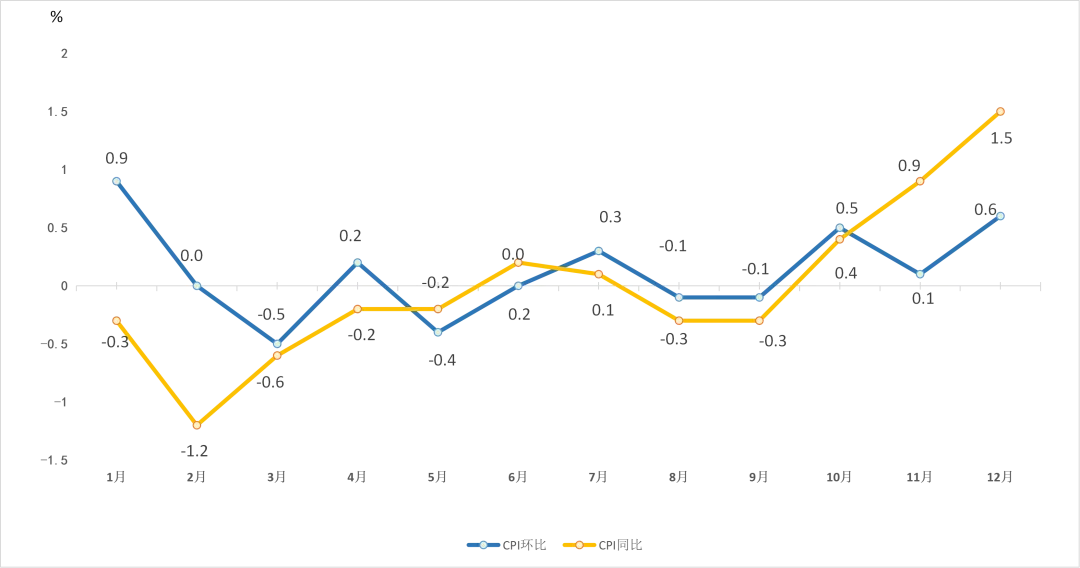 12月份,食品烟酒价格同比上涨2.9%,影响CPI(居民消费价格指数)上涨约0.80个百分点。食品中,菜及食用菌价格上涨21.4%,影响CPI上涨约0.48个百分点;干鲜瓜果类价格上涨9.5%,影响CPI上涨约0.26个百分点;薯类价格上涨7.1%,影响CPI上涨约0.01个百分点;畜肉类价格上涨3.3%,影响CPI上涨约0.09个百分点,其中,牛肉和羊肉价格分别上涨16.0%和5.9%。