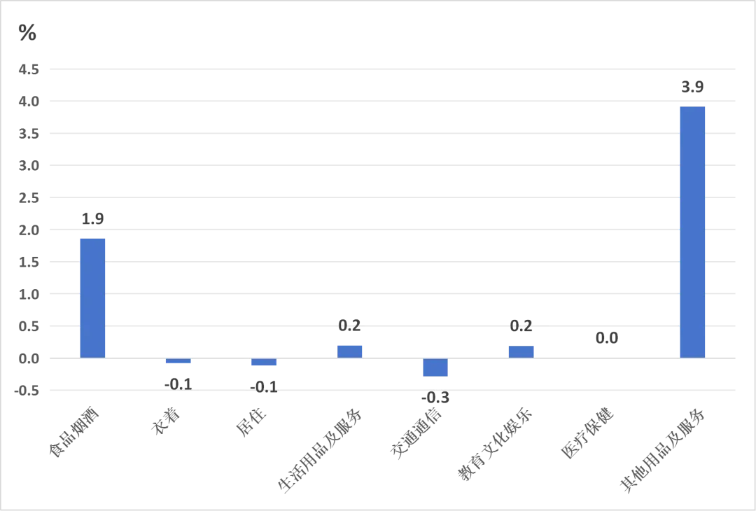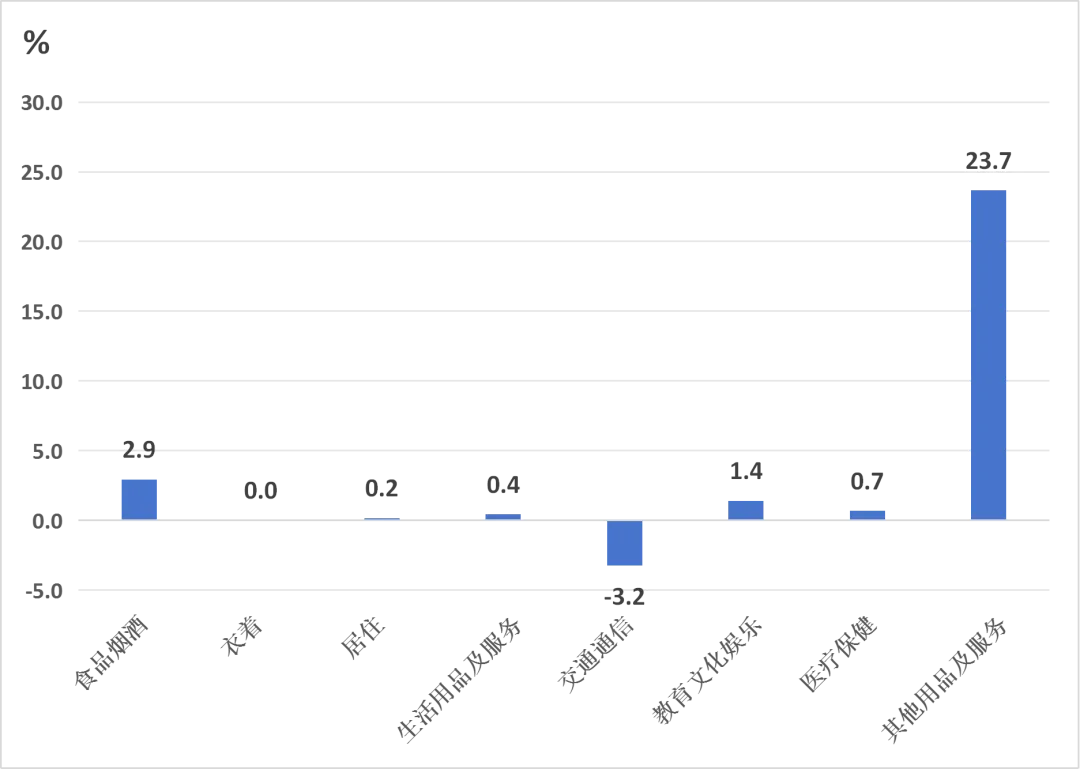 其他七大类价格同比“五涨一降一平”。其中,其他用品及服务、教育文化娱乐、医疗保健、生活用品及服务和居住价格分别上涨23.7%、1.4%、0.7%、0.4%和0.2%;交通通信价格下降3.2%;衣着价格持平。