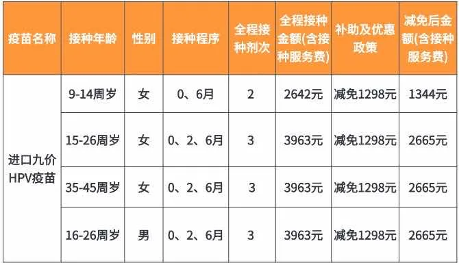 全程三针(15-26周岁女性、35-45周岁女性、16-26周岁男性),按照0,2,6月龄接种,自费接种第一针和第二针,第三针免费接种(需付23元接种服务费),立省1298元。