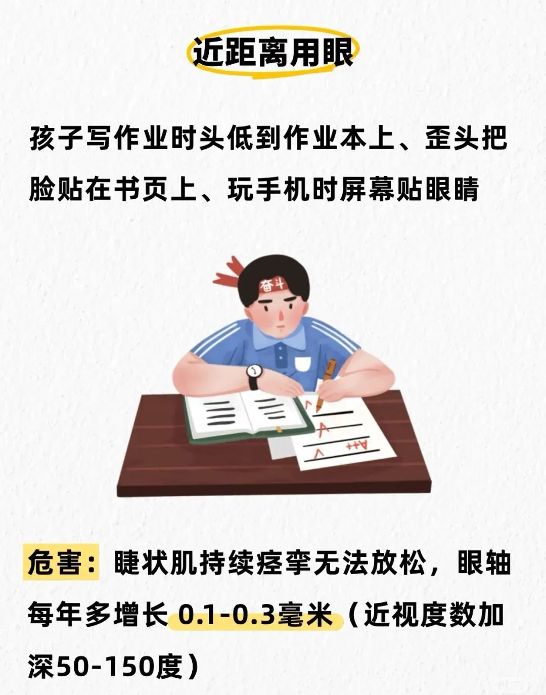 ⚠️危害:睫状肌持续痉挛无法放松,眼轴每年多增长0.1-0.3毫米(近视度数加深50-150度)
