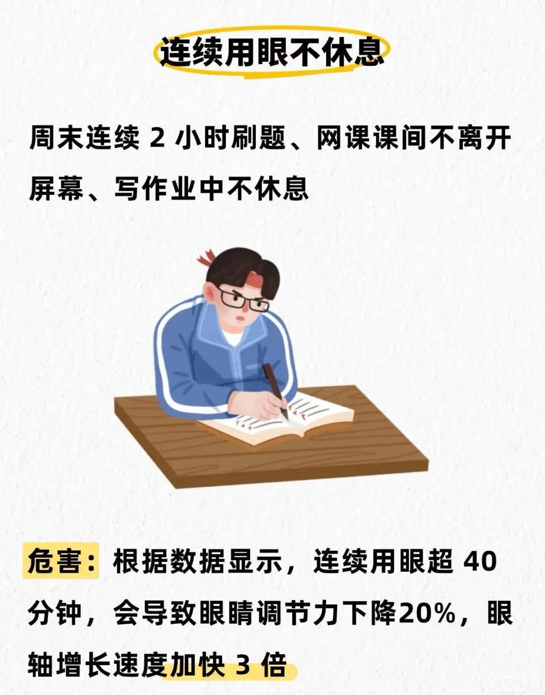 ⚠️危害:根据数据显示,连续用眼超40分钟,会导致眼睛调节力下降20%,眼轴增长速度加快3倍❗️