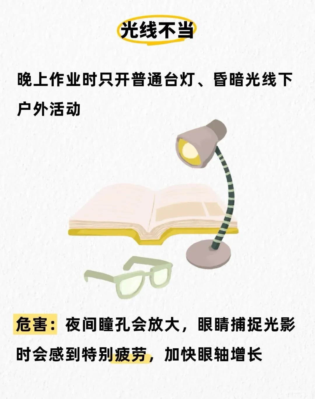 ⚠️危害:夜间瞳孔 会放大,眼睛捕捉光影时会 感到特别疲劳