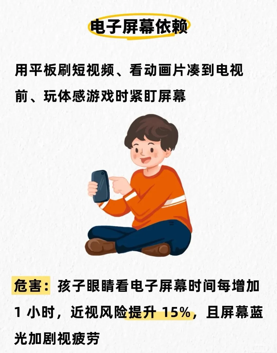 ⚠️危害:孩子眼睛看电子屏幕时间每增加1小时,近视风险提升⬆️ 15%,且屏幕蓝光加剧视疲劳 📈
