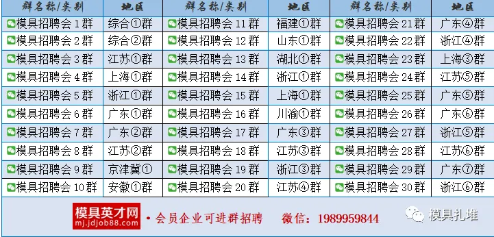 同期运营100+模具行业求职招聘群,可加客服微信!请备注岗位