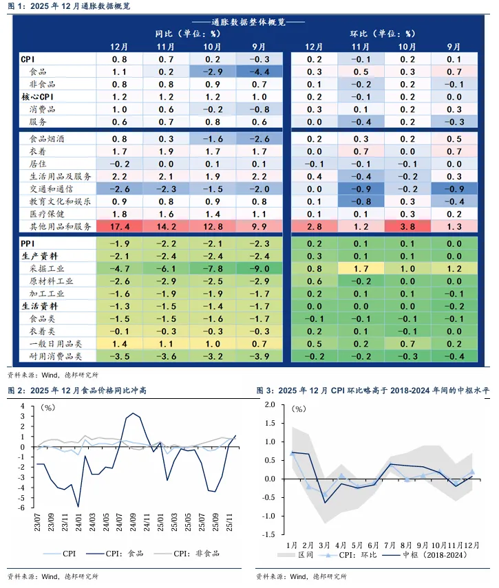 2025年12月通胀延续温和回升、价格中枢继续抬升:12月居民消费价格指数(CPI)同比上涨0.8%,前值为+0.7%,达到2023年3月以来最高水平。CPI环比上涨至正增长区间,由11月的-0.1%转为+0.2%。核心CPI同比上涨1.2%,与前值持平,已连续第四个月保持在1%以上。物价总体延续温和回升态势。与此同时,工业生产者出厂价格指数(PPI)同比下降1.9%,降幅较上月收窄0.3%,且环比连续3个月保持正增长(+0.2%),显示工业品价格在低位持续修复、通缩压力边际缓解。