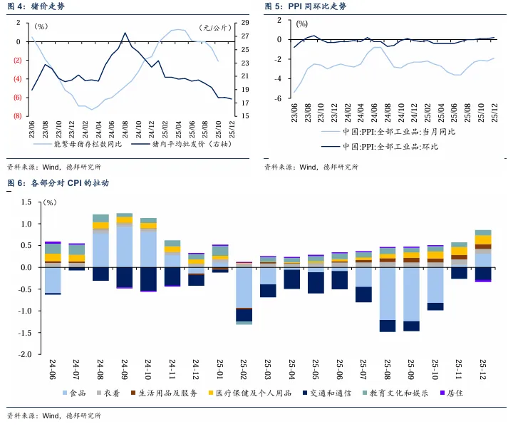 春节错位效应下的节奏预判。2026年的春节落在2月17日,较2025年(1月29日)偏晚。这种“春节错位”或将对1月CPI产生一定的扰动。由于去年春节在1月底,今年1月缺乏春节带来的食品和服务涨价效应,叠加去年同期的高基数,1月CPI同比读数可能面临一定的回落压力。但考虑到“反内卷”带来的工业消费品价格企稳,以及核心CPI的韧性,下行空间有限,我们认为不太可能重回负区间。