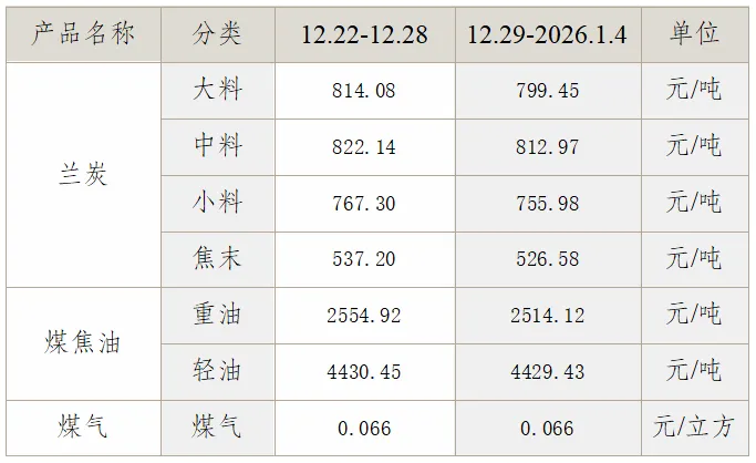 兰炭及其附属产品平均价格(2025.12.22-2026.1.4)