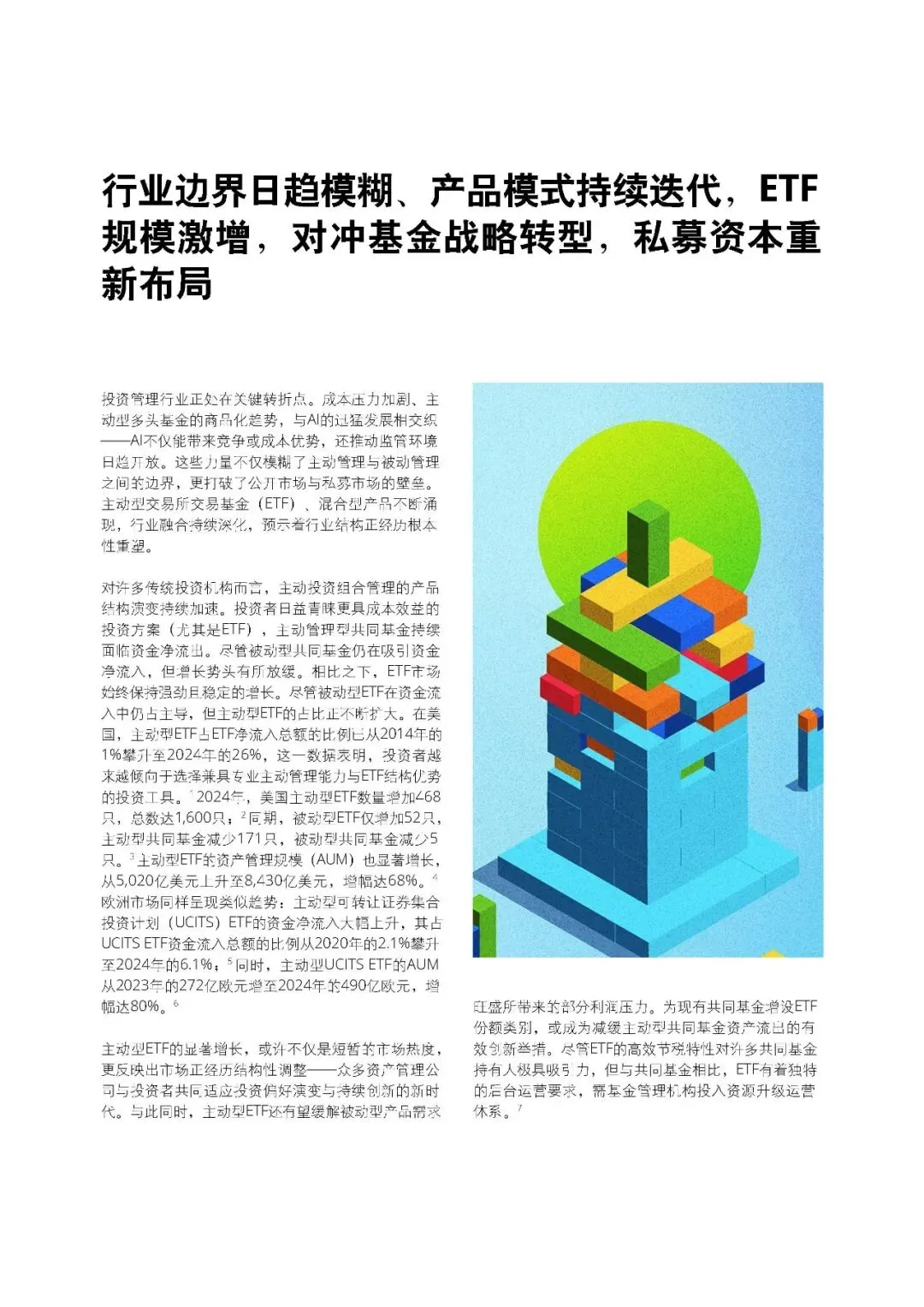 曾经,主动管理与被动管理、公募与私募市场之间有着清晰的界限。然而,如今这些边界正变得模糊。调研显示,主动型交易所交易基金(ETF)和混合型产品的兴起,正在打破传统的行业结构。2024年,美国主动型ETF数量增加468只,总数达1600只,其资产管理规模(AUM)从5020亿美元上升至8430亿美元,增幅达68%。被动型ETF的吸引力有所下降,仅增加52只。投资者对兼具主动管理能力和ETF结构优势的产品越来越喜爱。