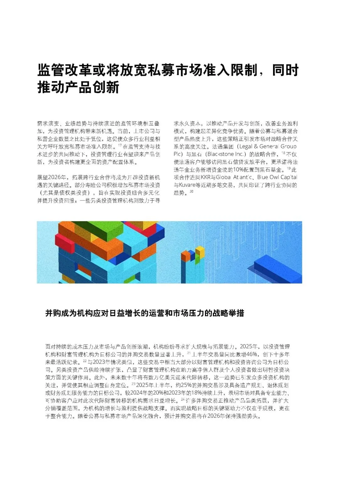 并购成为机构应对市场压力的重要手段。通过整合资源,机构能够提升运营效率,优化产品结构,并更好地满足客户需求。随着公募与私募市场产品深化融合,预计并购交易将在2026年保持强劲势头。