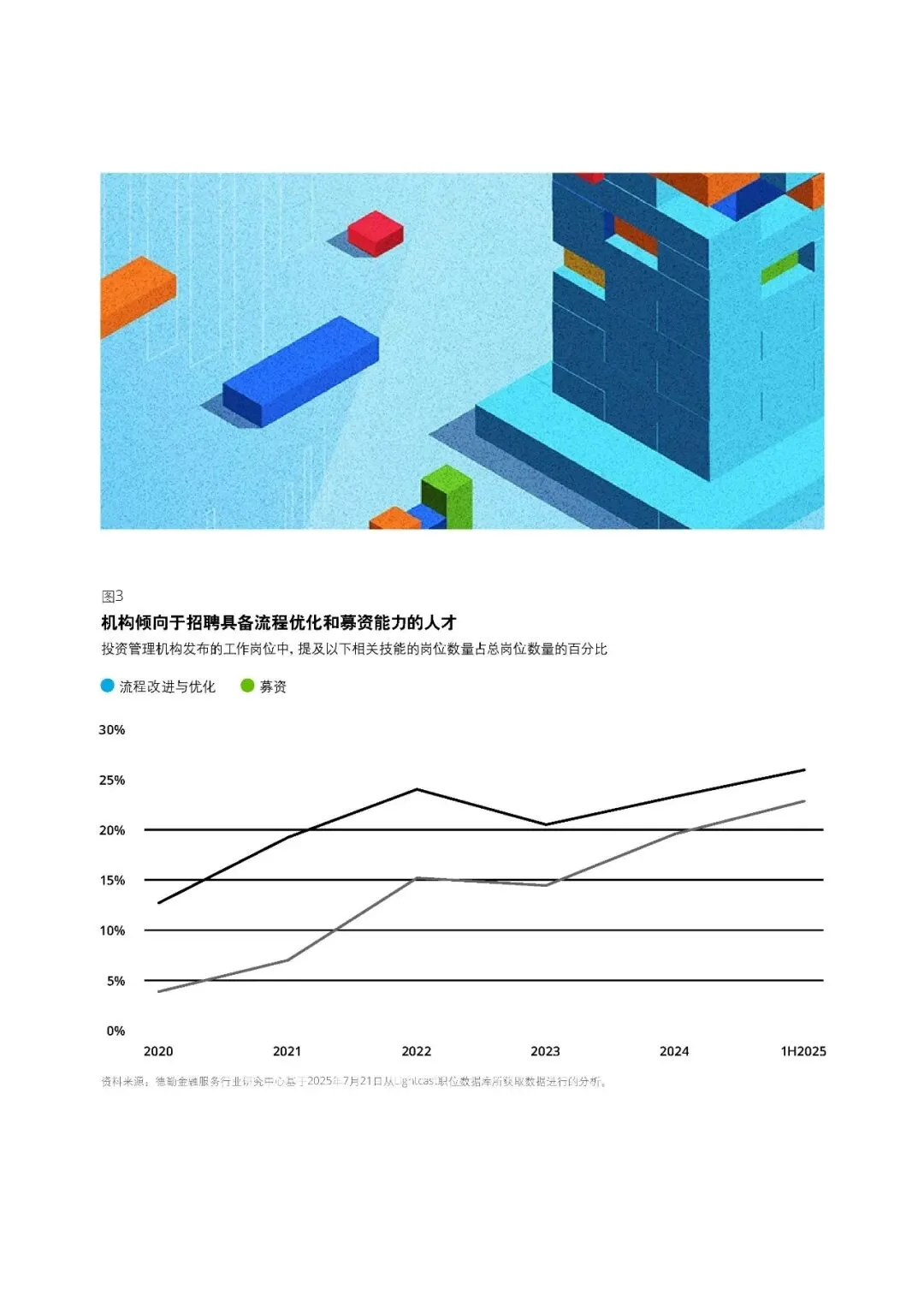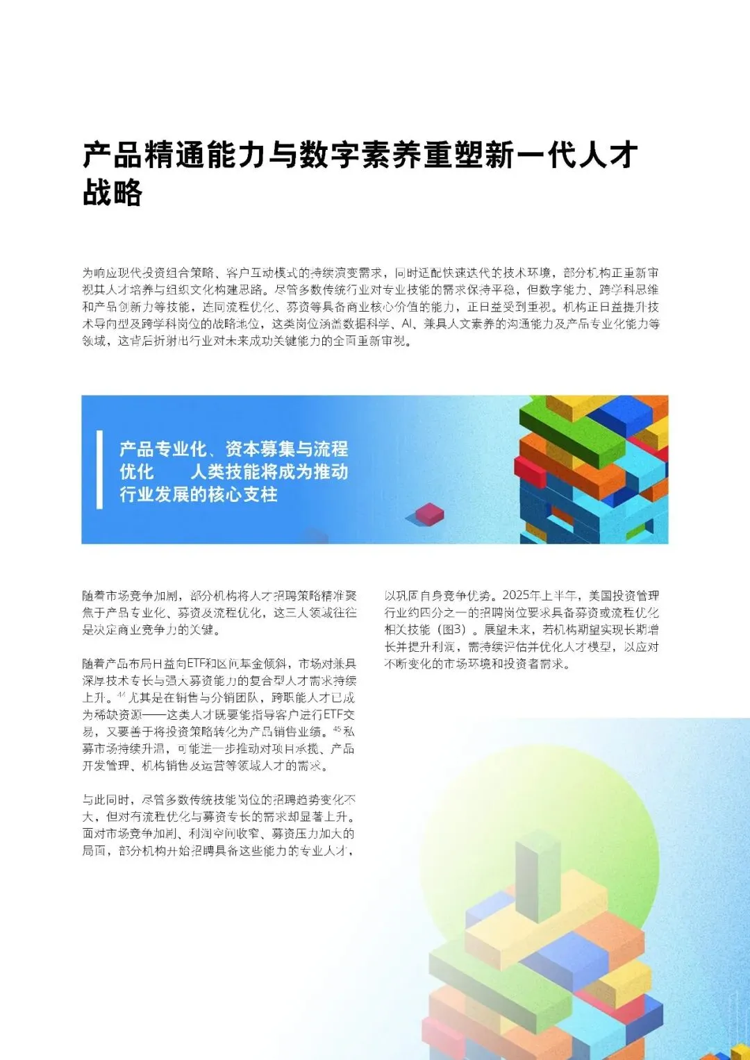 2025年上半年,美国投资管理行业约四分之一的招聘岗位要求具备募资或流程优化相关技能。机构正将人才招聘策略聚焦于产品专业化、募资及流程优化,以巩固自身竞争优势。对AI与提示工程人才的需求也在增加,推动了文理学院毕业生加入投资团队。这种趋势反映出行业对批判性思维与创造力的重视,以及技术专长与人文素养的互补需求。