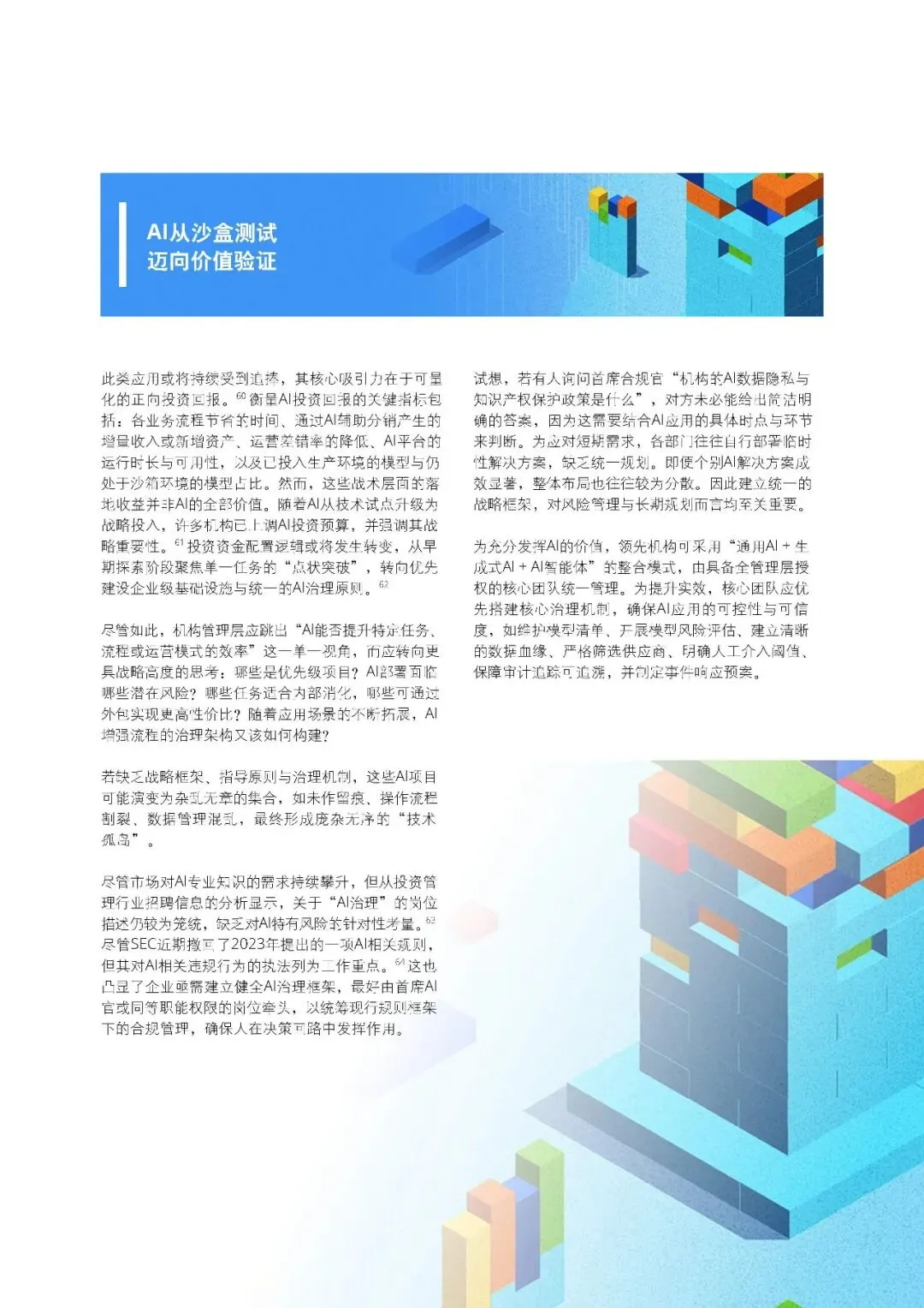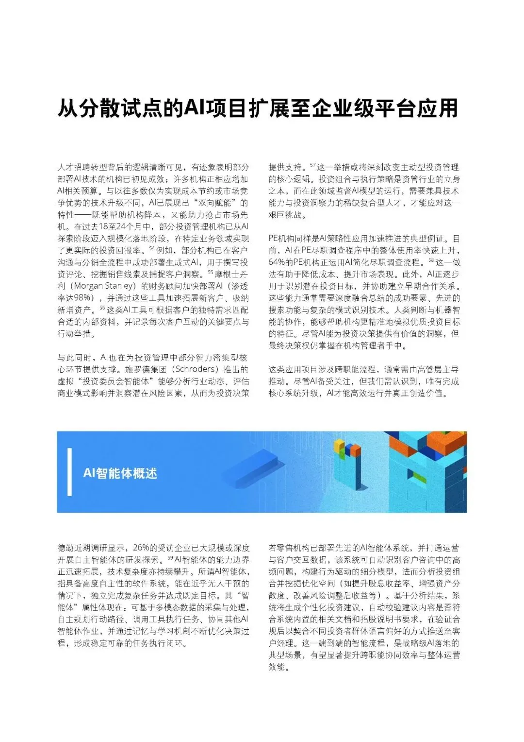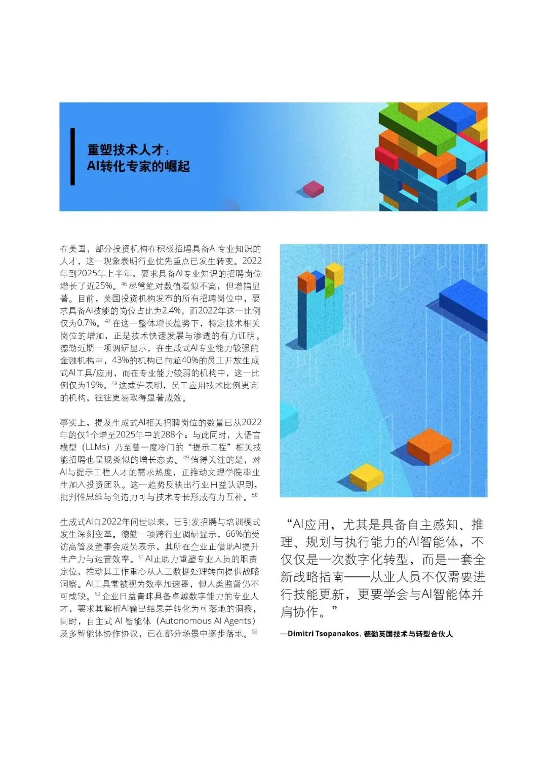 AI技术正在从孤立的试点项目扩展到企业级平台应用。调研指出,AI不仅能带来竞争或成本优势,还推动了监管环境的开放。2022年至2025年上半年,要求具备AI专业知识的招聘岗位增长了近25%。投资管理机构正将AI视为提升竞争力的关键工具。
