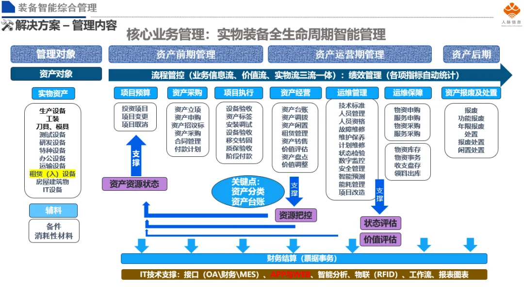 :资产前期业务(项目预算、资产采购、项目执行)、资产运营期管理(资产经营、运维管理、运维保障)、资产后期(资产报废及处置)。