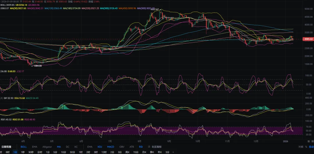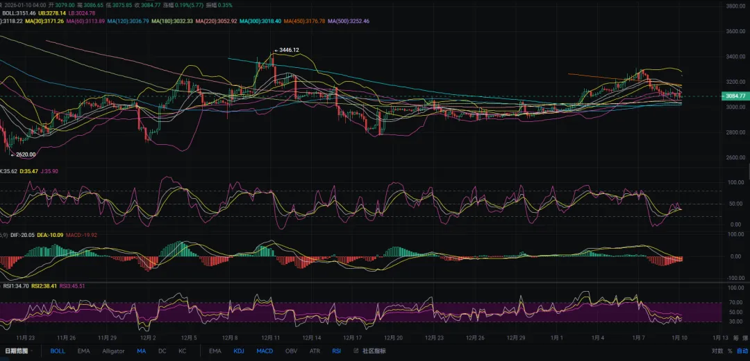 日图中k线尚未下破中轨,KDJ与RSI交叉向下接近超卖区,空头有待延续,值得关注的是快慢线处于金叉后收口形态,也还未形成死叉,后续若空头强势放量打破3000重要关口形成死叉局面的话则可能再次回调到下轨位置!思路上历辉建议继续保持高空介入,等4小时再次出现超卖后可以选择短多入场!