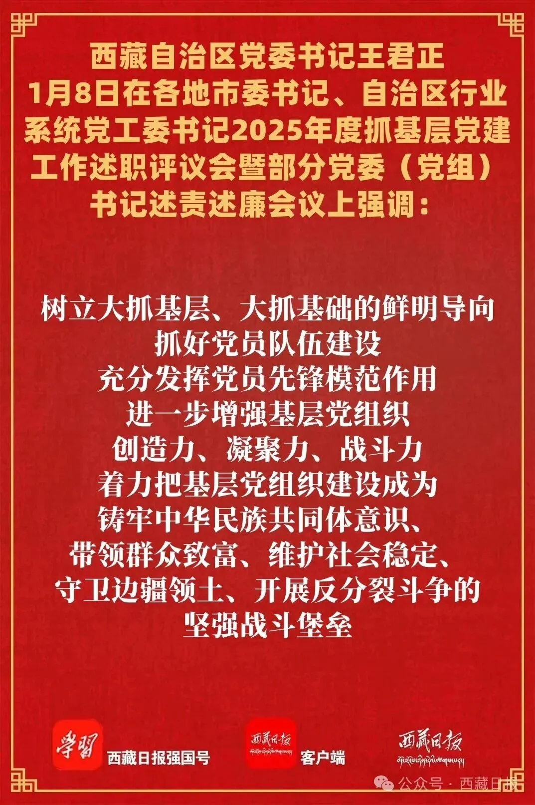 1月8日,自治区党委召开各地市委书记、自治区行业系统党工委书记2025年度抓基层党建工作述职评议会暨部分党委(党组)书记述责述廉会议。自治区党委书记王君正主持并讲话,强调,要深入贯彻落实习近平总书记关于党的建设的重要思想、关于西藏工作的重要指示和新时代党的治藏方略,坚持新时代党的建设总要求,以永远在路上的坚韧和执着,持之以恒抓好基层党建工作,不断增强基层党组织创造力、凝聚力、战斗力,以高质量党建引领社会主义现代化新西藏建设。