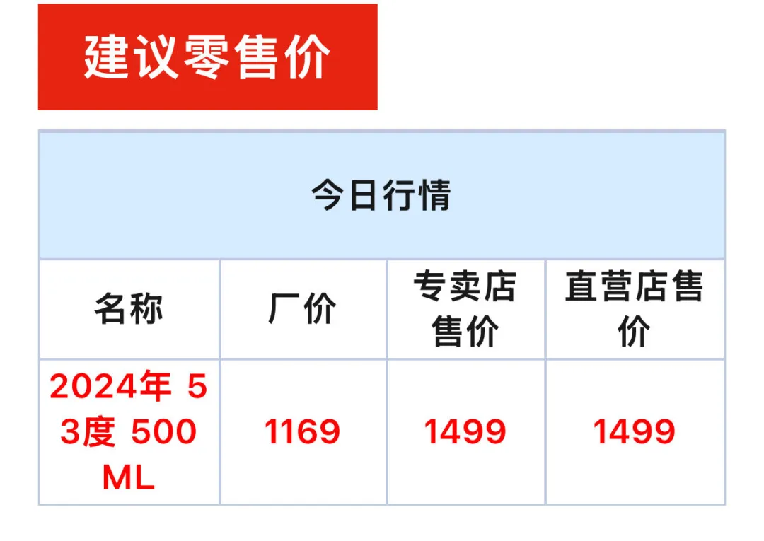 建议零售价今日行情名称厂价专卖店售价直营店售价2024年 53度 500ML11691499