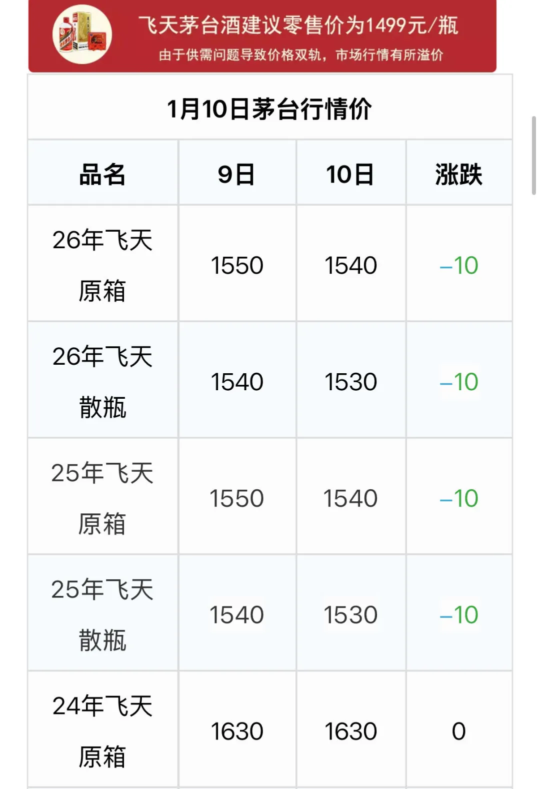 >飞天下跌!茅台酒1月10日行情价