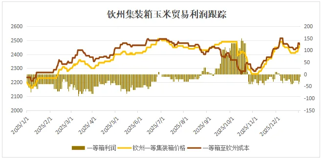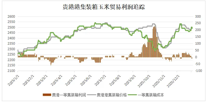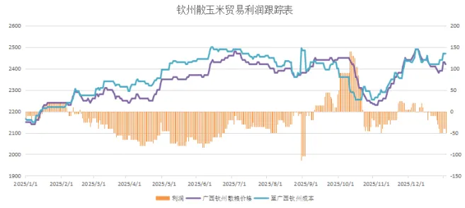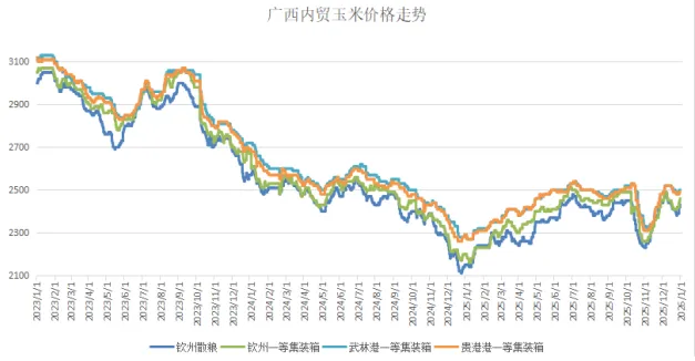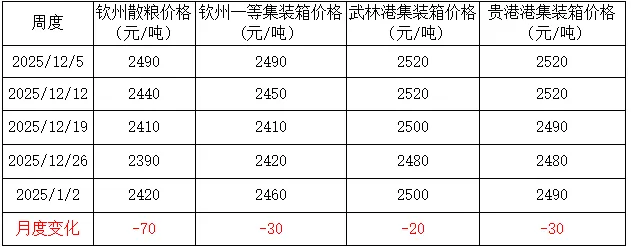 表1,2025年11月份、2025年12月份北部湾港口内贸玉米到货、走货及日均出货对比:广西北部湾港口本月玉米价格小幅震荡,截至12月31日,钦州港二等散装玉米价格为2410-2430元/吨,较月初跌30元/吨左右;钦州一等集装箱玉米价格为2460-2480元/吨左右,较月初涨20元/吨左右;西江流域玉米行情小幅上涨,截至12月31日,武林港集装箱玉米价格为2490-2510元/吨,较月初涨20元/吨左右;贵港港集装箱玉米价格为2480-2500元/吨,较月初涨10元/吨左右。(详见表2、图1、图2及图3)