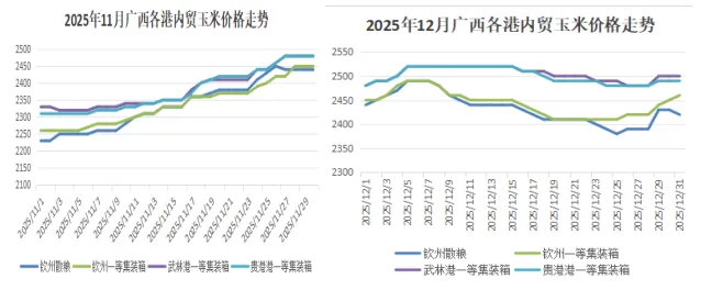 图2,2025年11月广西各港内贸玉米价格走势;图3,2025年12月广西各港内贸玉米价格走势