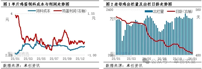 在过去蛋鸡养殖业发展的过程中,养殖单位习惯于鸡蛋价格的季节性波动规律,结合蛋鸡正常生长周期,一般在春节前、中秋后积极出栏大日龄低产能的老母鸡,在3-5月份积极补栏新鸡苗。虽春节传统出栏时间点尚未正式开启,因单斤鸡蛋利润由持续亏损,产区养殖单位为减少亏损,局部出现明显提前出栏的心态,积极出栏产蛋率不高的适龄蛋鸡,截至2025年12月底,老母鸡出栏日龄较上月底提前5天,农贸市场及屠宰端正常开工收鸡,全国老母鸡市场出栏量环比增幅超1%,蛋鸡行业启程“去产能”之旅,但实际去产能速度可能慢于预期。