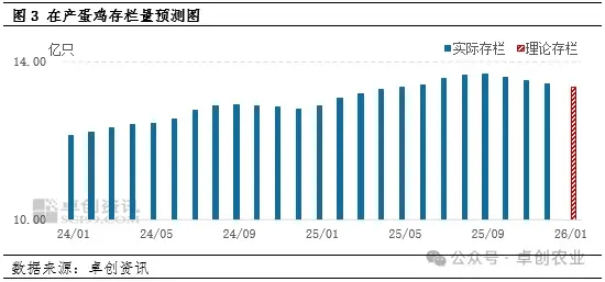 2026年1月新开产的蛋鸡主要是9月前后补栏的鸡苗,此阶段养殖单位补栏积极性不高,鸡苗月度销量环比减幅超1.5%,因此1月进入开产期的蛋鸡数量或继续减少。老母鸡方面,根据老母鸡日龄及鸡苗销量推算,2026年1月理论待淘老母鸡数量或环比增加,叠加养殖单位为避免春节后低迷行情,节前多有季节性淘汰需求,故预计1月出栏量或呈增加趋势。综合来看,1月新开产蛋鸡数量或小于淘汰鸡出栏量,预计在产蛋鸡存栏量或延续微幅减少的趋势,环比减幅或仍低于1%。鸡蛋供应量持续下降,加之临近春节,食品厂采购量增加,下游备货积极性提升,市场需求好转,市场供需关系收紧,期末库存预估值下降,对鸡蛋行情形成支撑。
