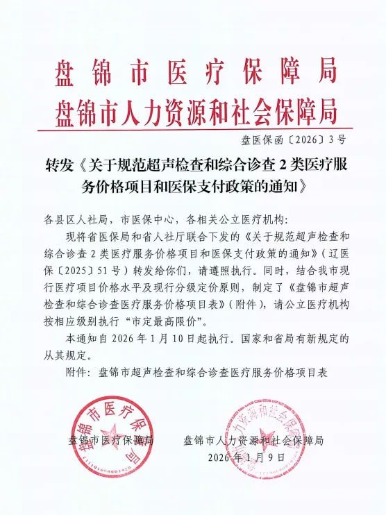 根据盘锦市医疗保障局、盘锦市人力资源和社会保障局联合下发的《关于规范超声检查和综合诊查2类医疗服务价格项目和医保支付政策的通知》(盘医保【2026】3号)文件要求,将调整门诊诊查费等相关医疗服务项目价格,相关调整严格遵照文件规定执行。