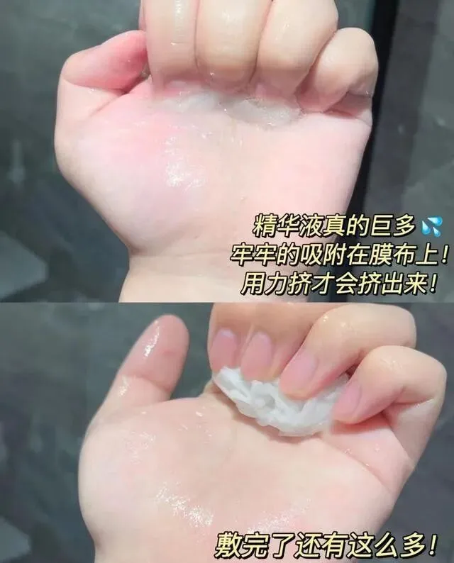 补水效果是真的好 , 干皮敷完脸软软的 , 面膜揭下来还能挤出一堆精华 , 敷完脸上那层精华我都舍不得洗。