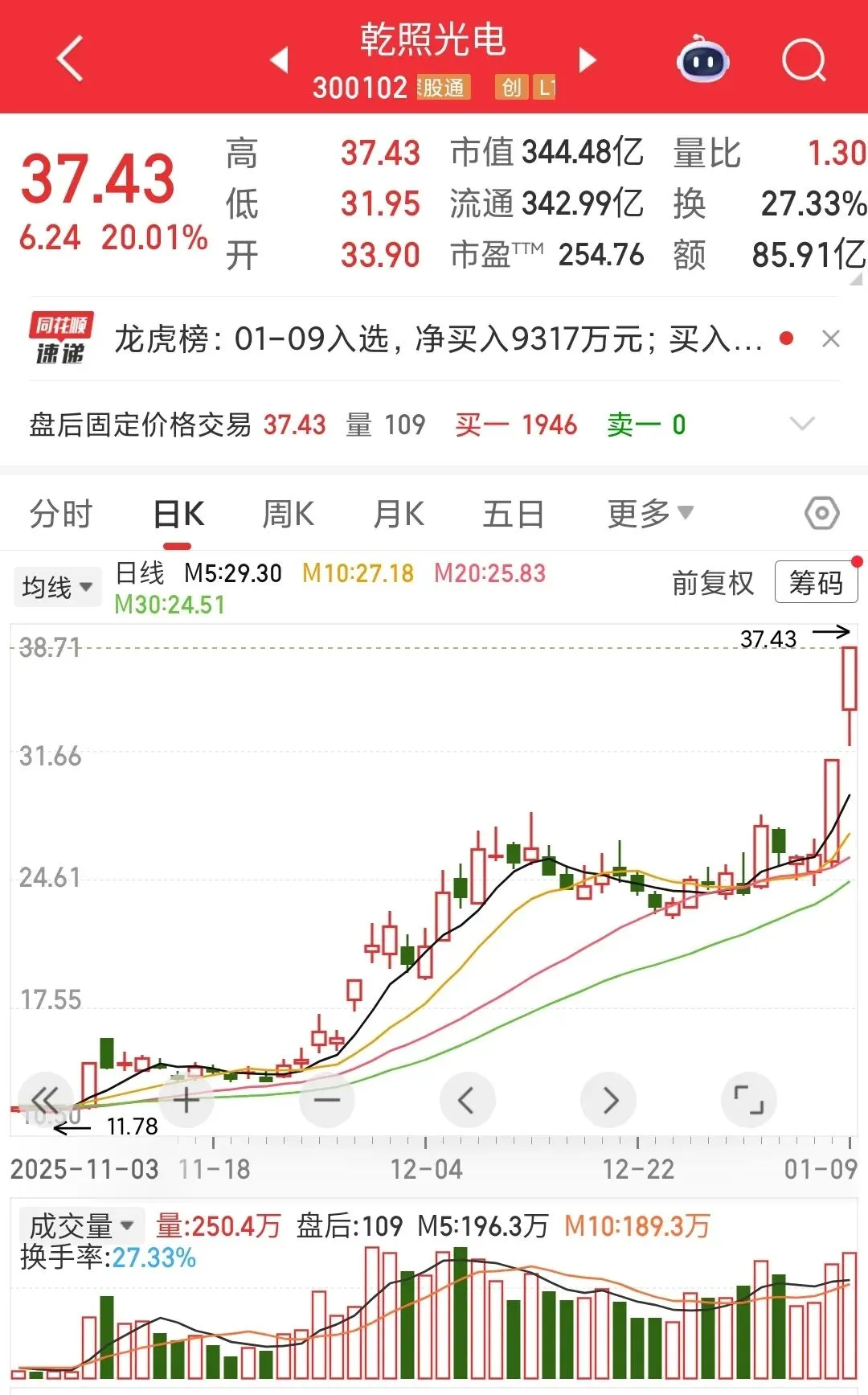 核心看点:Mini LED+商业航天双轮驱动,短期股价强势但盈利与财务风险需警惕 。截至2026-01-09,股价37.43元,总市值344.48亿元,市盈率TTM254.76,连续两日20cm涨停,换手率高,交易活跃。