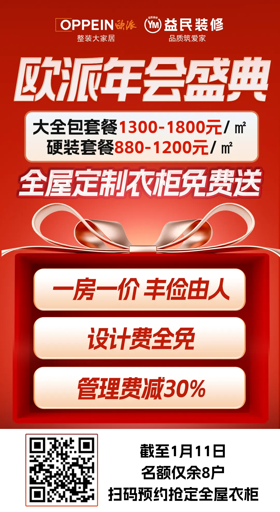 为庆祝欧派家居战略新篇章,益民装修特别推出 “装修送衣柜”活动:即日起至1月11日,签约益民装修整装服务,即送欧派全屋定制衣柜!