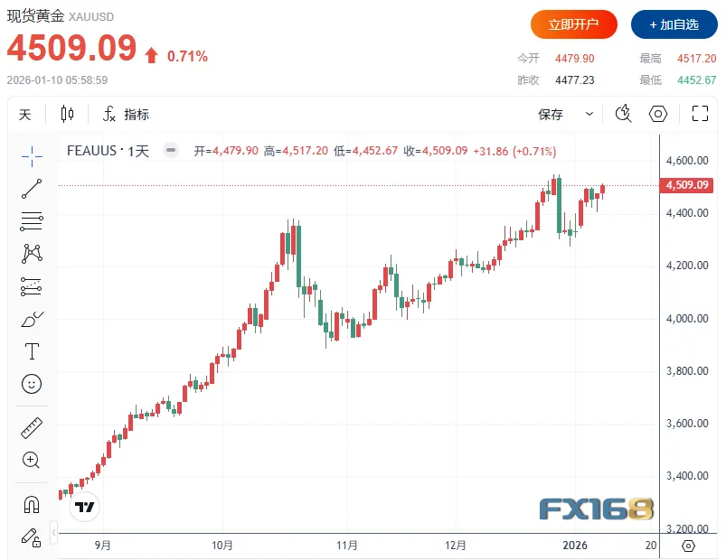在美国劳工统计局公布12月就业增长弱于预期后,金价正在测试4500美元的初步阻力位。周五(1月9日)美市尾盘,现货黄金收报4509.03美元/盎司,上涨31.86美元/盎司,涨幅0.71%,本周上涨176.83美元或4.08%。