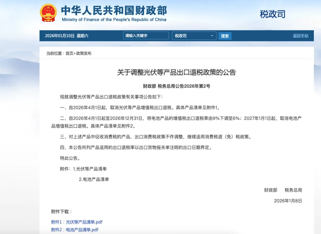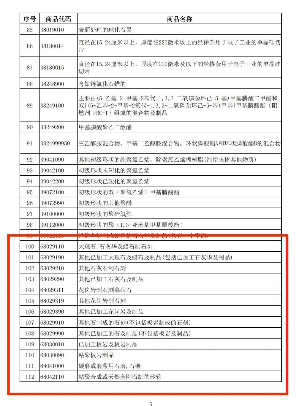 2026年1月8日,财政部一纸公告引发多个行业重点关注:自2026年4月1日起,取消光伏等产品增值税出口退税,电池产品的增值税将从9%下调至6%。其中,光伏等产品清单中,“其他已加工大理石及制品”(68029190)到各类水泥预制构件,足足33个与石材紧密相关的编码赫然在列。
