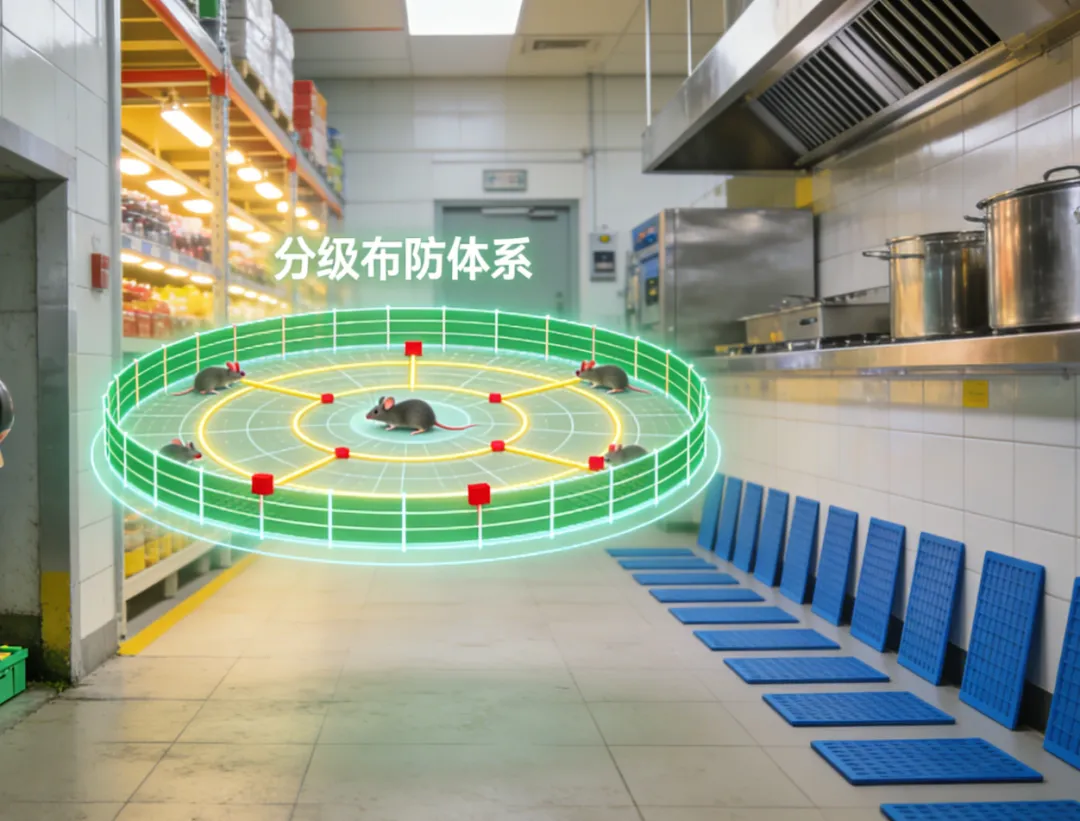 - 分级布防体系:沿酒店建筑外围按 15-25 米标准间距布设鼠饵站,构建第一道外围防护屏障;在厨房、餐厅、员工通道、管线井等室内关键区域科学布放粘鼠板、捕鼠器,建立第二道内部防线;同步在门内侧、管道穿墙孔洞等关键节点安装挡鼠板、封堵缝隙并增补粘鼠屋,全面阻断鼠类侵入路径。