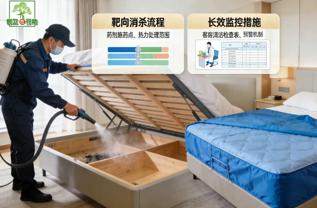 将臭虫专项检查纳入酒店日常客房清洁标准化流程,对重点区域实施定期监测;建议为已处理房间配套使用专业防虫床罩、枕罩进行物理隔离,并提供针对性预防建议,构建全流程持续管理的长效预警机制。
