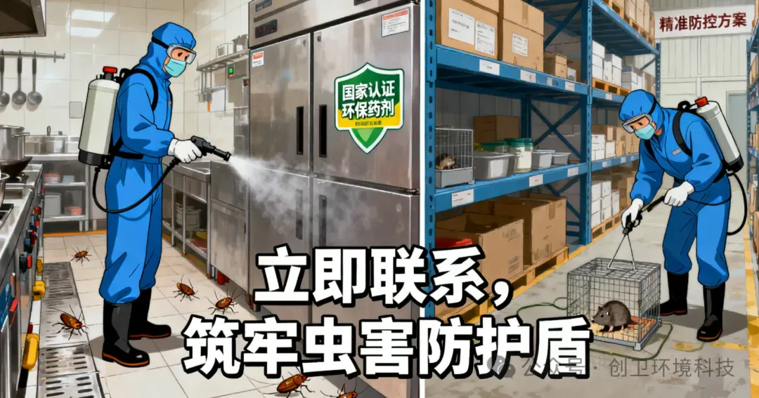 餐饮卫生不达标?仓储商品遭虫害破坏?办公环境受蟑螂困扰?立即联系 河南创卫环境科技---- 病媒生物防制消杀公司,专业团队上门解决,为您的经营和办公环境筑牢虫害 “防护盾”,助力合规经营、安心运营!