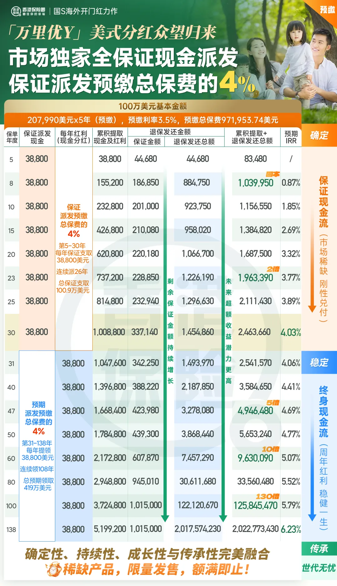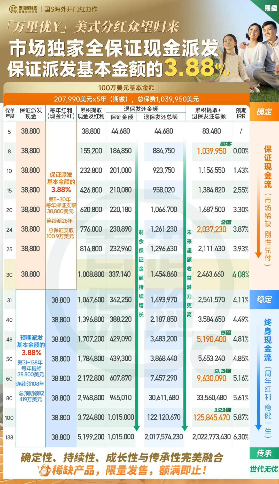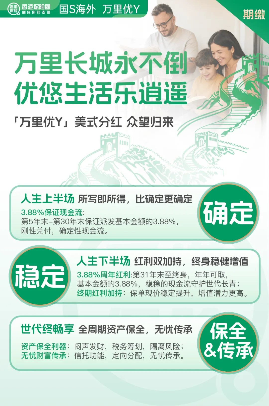 在充满不确定性的市场,如果想寻找一份确定的安心,「万L优悠」是绝佳之选。前30年3.88%全保证现金流,为人生上半场提供刚性托底;30年后终身派发3.88%周年红利,为人生下半场守护从容;更以丰富的类信托功能,为财富的代际传承保驾护航。