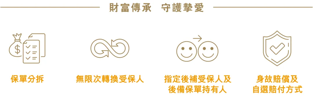 「万L优悠」四大核心传承功能:保单分拆、无限次转换受保人、后备机制(指定后备受保人和后备保单持有人)、身故赔偿自选赔付方式,实现财富的定向分配、跨代延续、风险隔离、税务筹划和高效传承,优悠相伴,传承无忧。